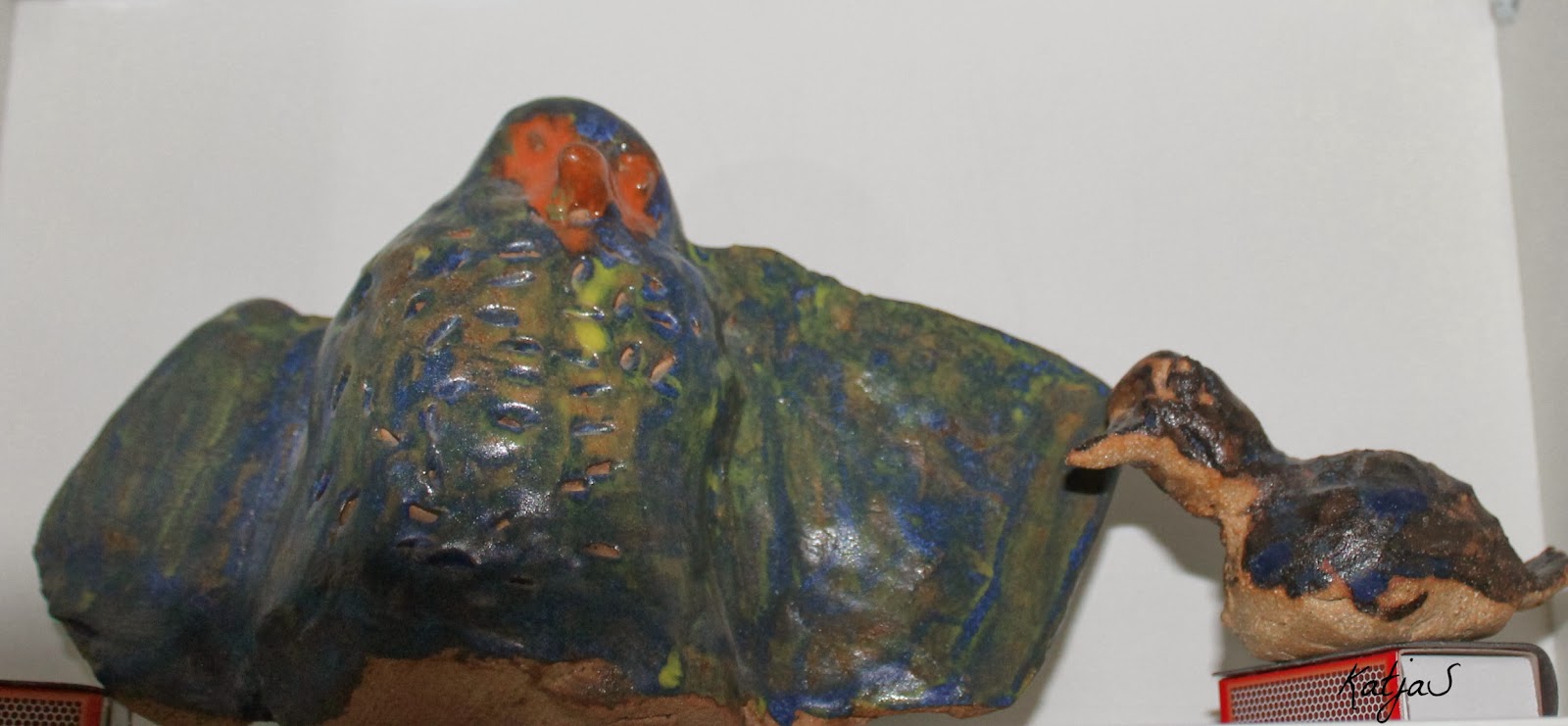Sekalainen kokoelma savitöitä rappujen ikkunalla |