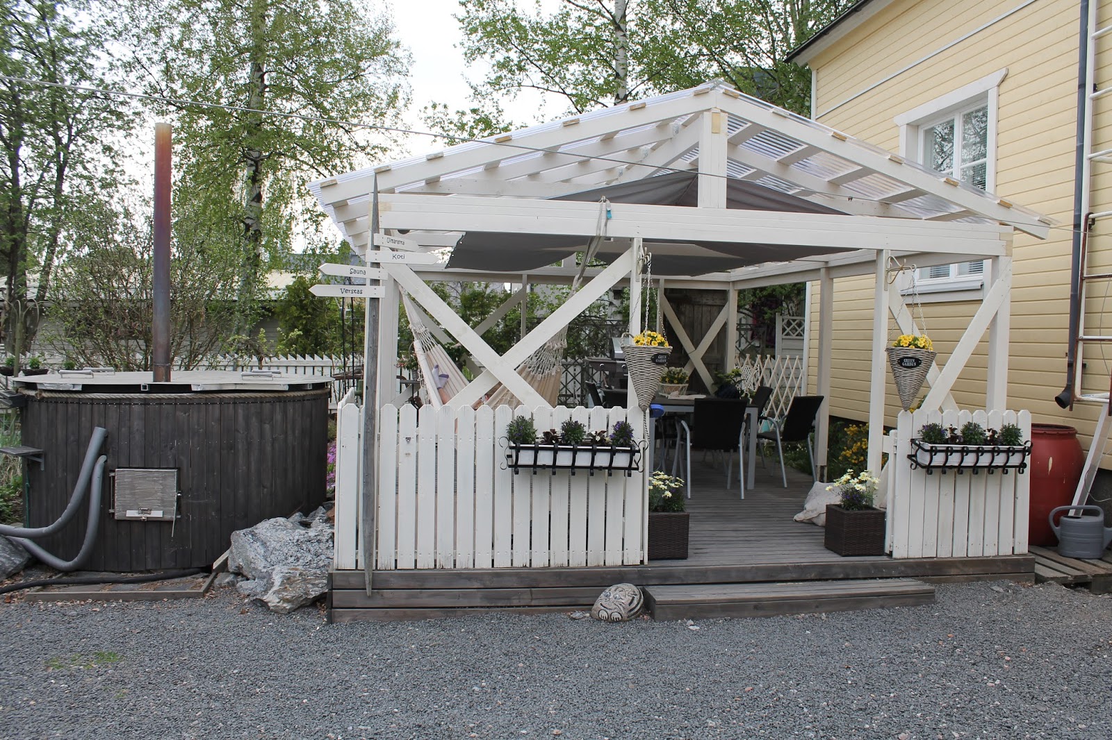 Nyt alkaa pihalla olla kaikki valmiina ensi lauantaita varten. Toivottavasti sää sallii ja juhlia voi viettää pihalla.